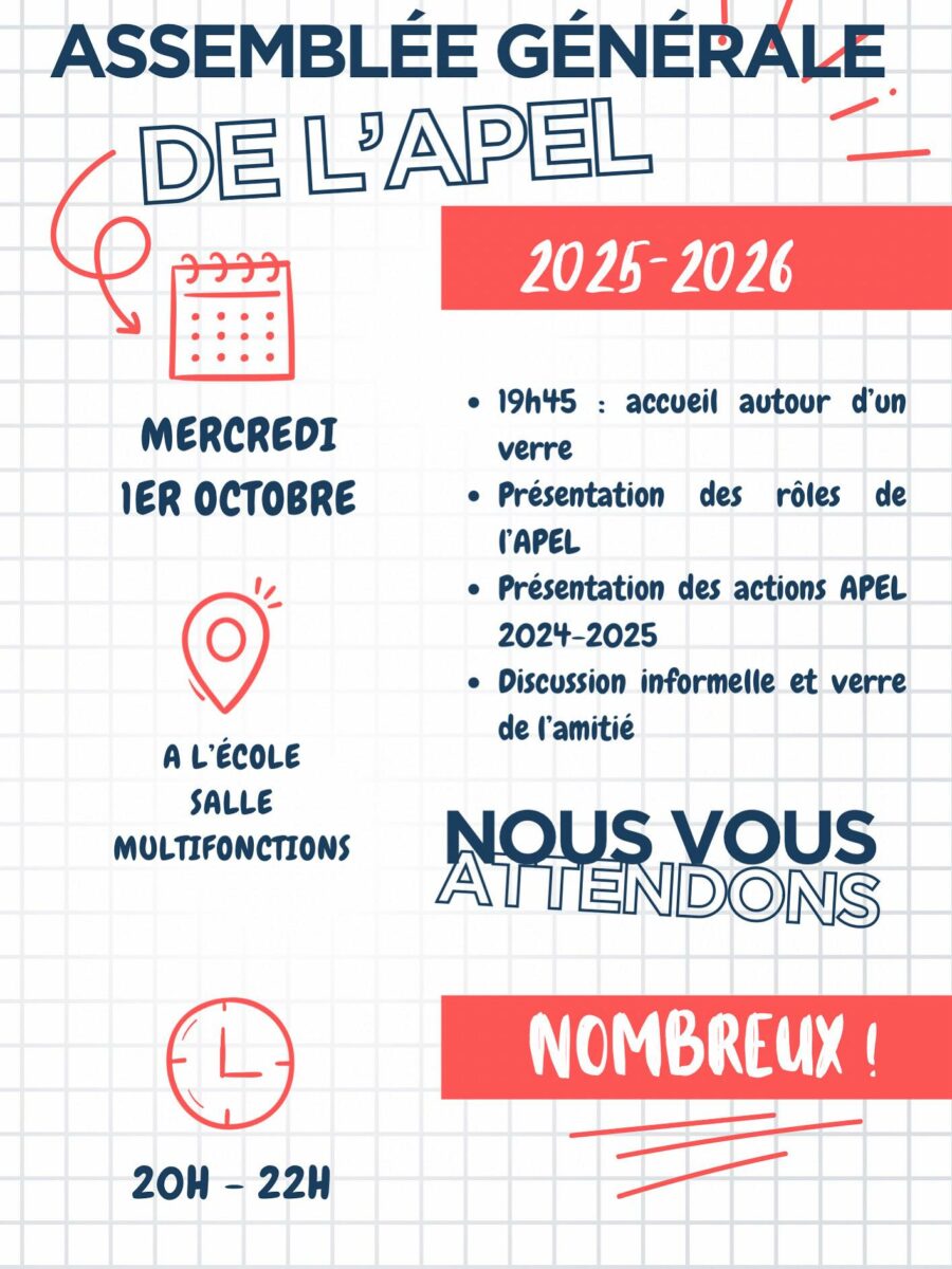L’AG de l’APEL c’est le mercredi 1er octobre à 20h à l’école. C’est l’occasion de savoir comment sont utilisés les sous durement gagnés et de comprendre comment vous parents (et peut être futurs membres APEL) pouvez contribuer. C’est aussi l’occasion pour nous de recueillir toutes vos idées et envies pour l’année qui débute, même les plus folles, on adore ! Venez nombreux, l’AG est ouverte A TOUS LES PARENTS D’ÉLÈVES de l’école.