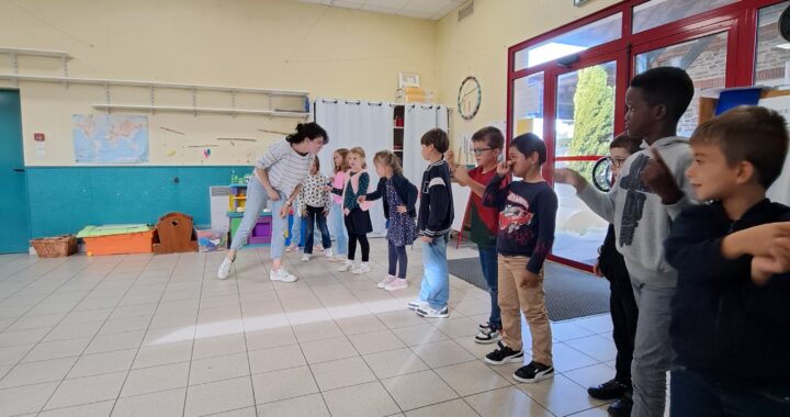 Ce sont 8 classes du CP au Cm2 qui beneficient 1 fois tous les 15 jours d’une séance de théâtre où divers sujets sont abordés, en lien avec les apprentissages, avec Leila l’intervenante.